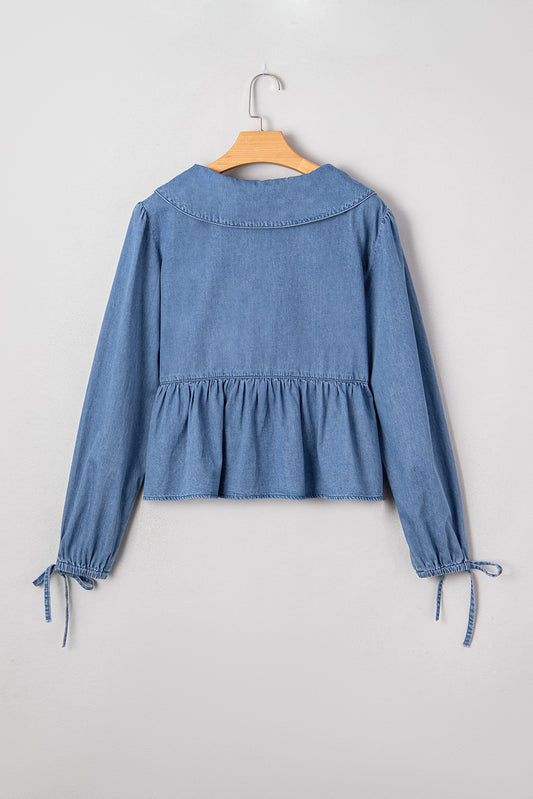 Dusk Blue Denim Lapel Neck Balloon Sleeve Tied Peplum Top
