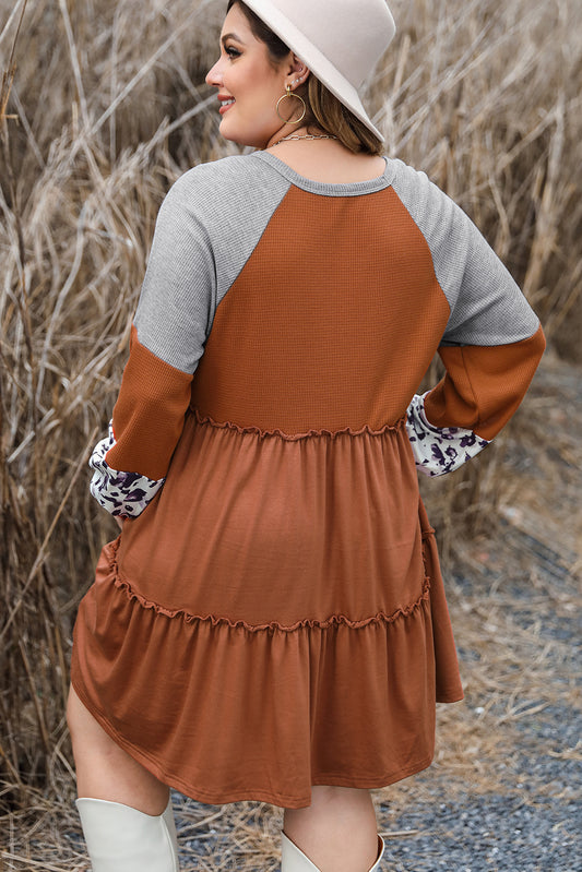Gold Flame Plus Size Waffle Leopard Long Sleeve Ruffle Mini Dress