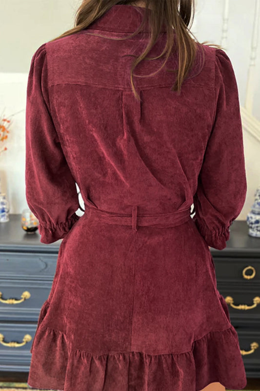Red Dahlia Collared Buttons Front Ruffled Hem Shirt Corduroy Dress