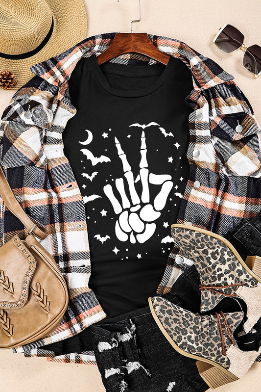 Black Halloween Bat & Skeleton Hand Graphic Tee
