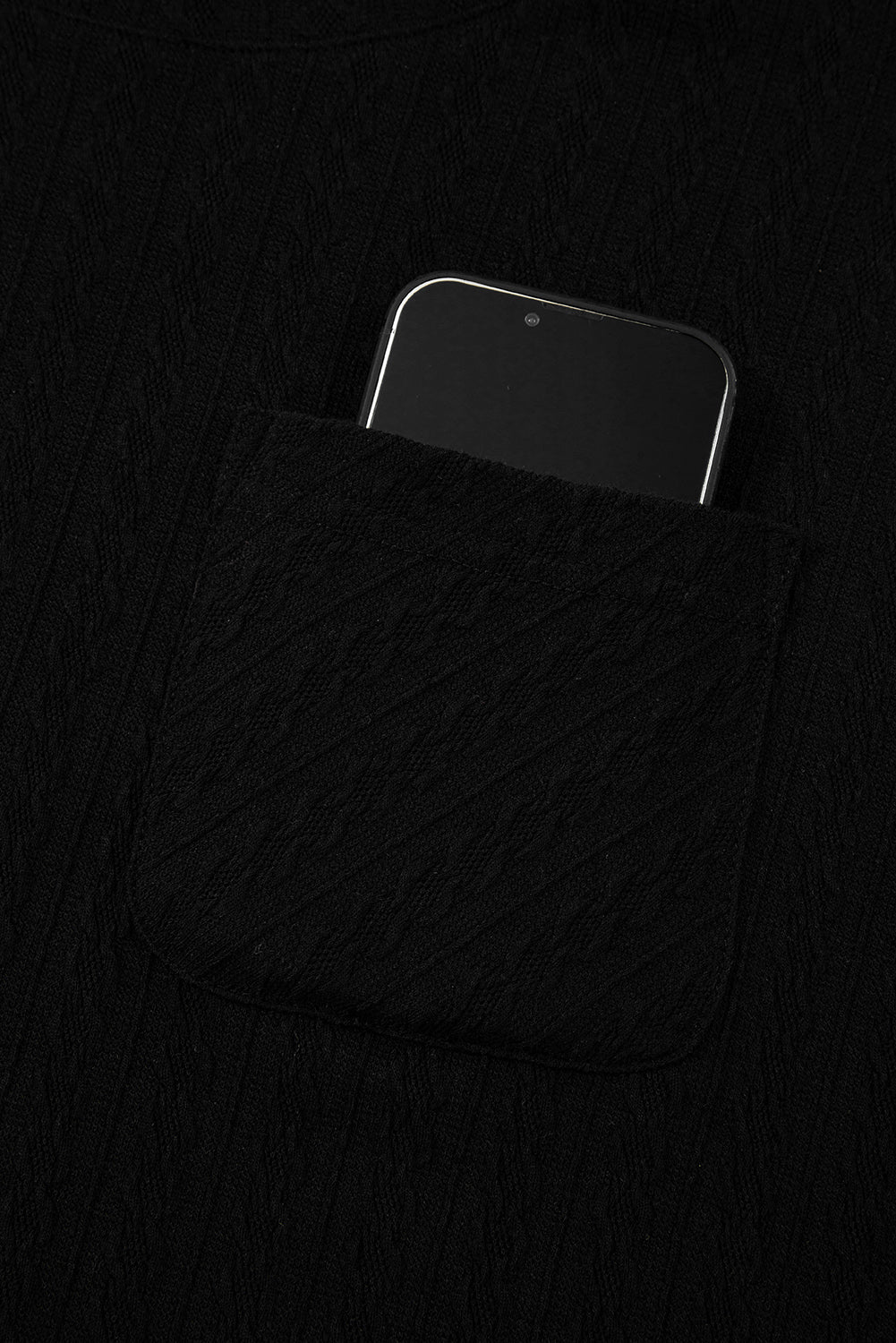 Black Textured Chest Pocket Long Sleeve Top 2Pcs Pants Set