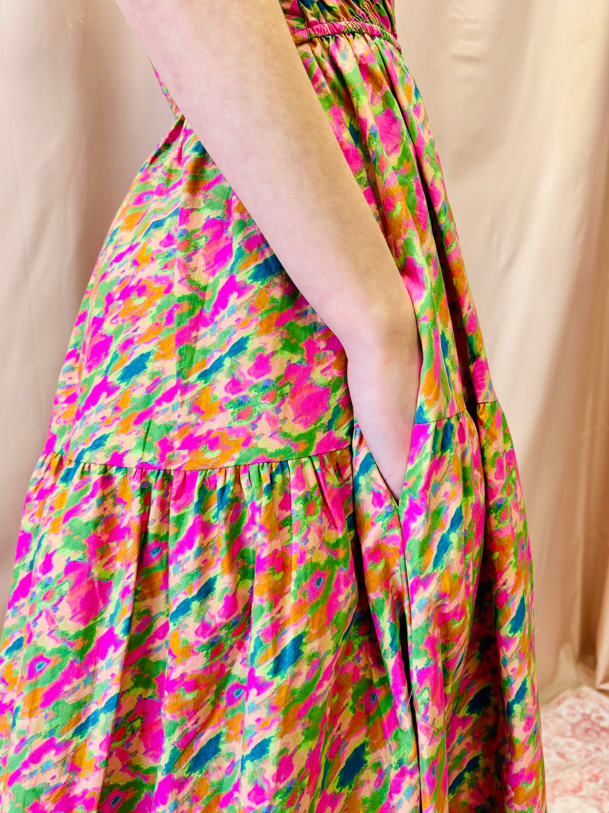 Brushed Print Bias Smocked Bust Maxi Dress