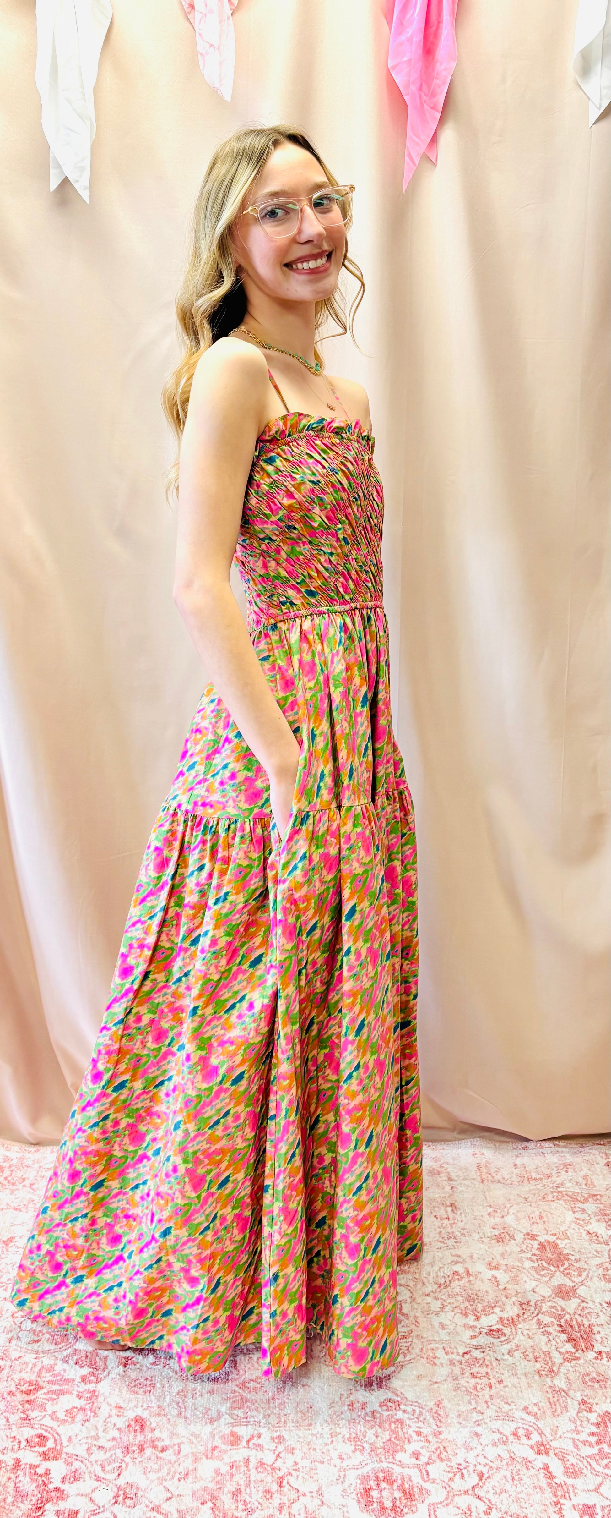 Brushed Printed Bias Smocked Bust Maxi Dress
